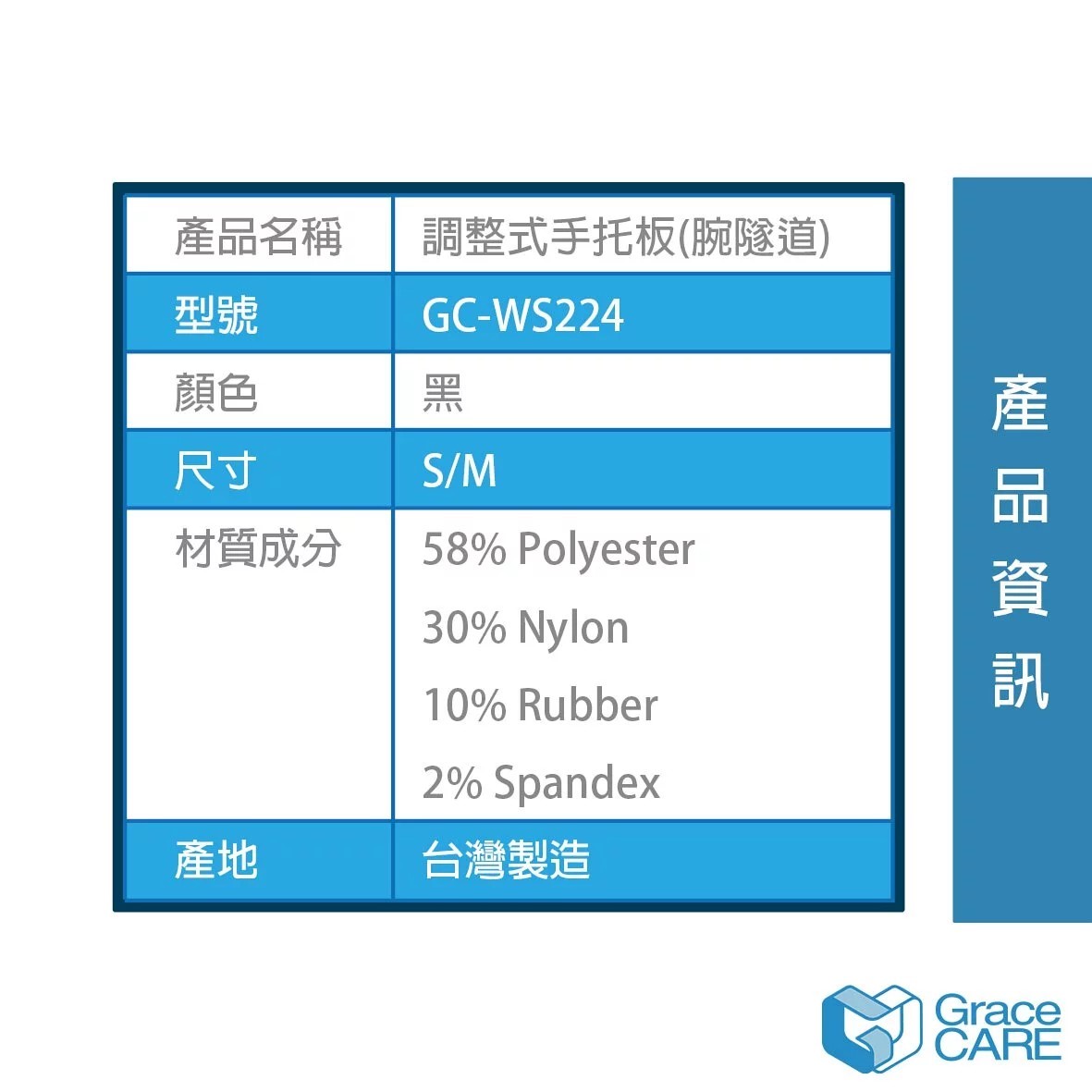 Grace CARE 腕隧道護腕 GC-WS224 (調整式手托板) 單盒一入(非一雙) 台灣製造 製造日期及有效期限: 請參考本體外包裝所標示 注意事項: 消費者使用前應詳閱說明書,使用本產品如有不適,請停止使用並請教醫師