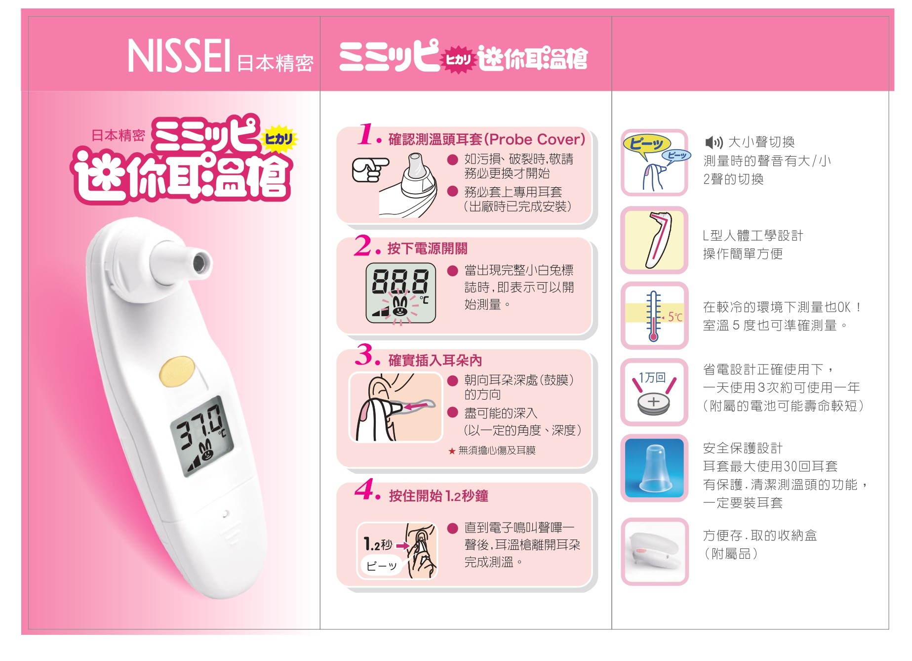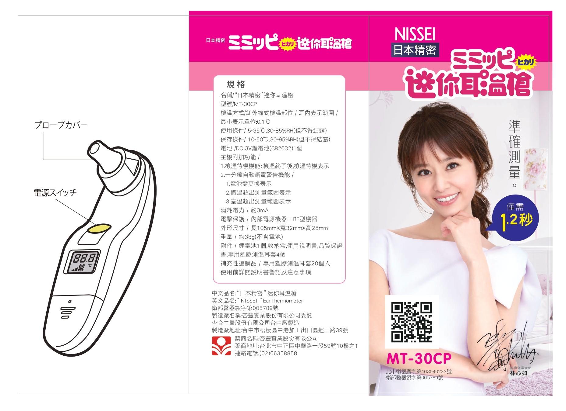 “日本精密”迷你耳溫槍 MT-30CP 檢溫方式 : 紅外線式 外形尺寸 : 長105mm X寬32mm X高25mm 重量 : 約38g(不含電池) 附件 : 電池1個 、收納盒 、使用說明書 、品質保證卡 、測溫耳套4個(MT-2020)