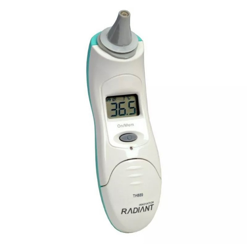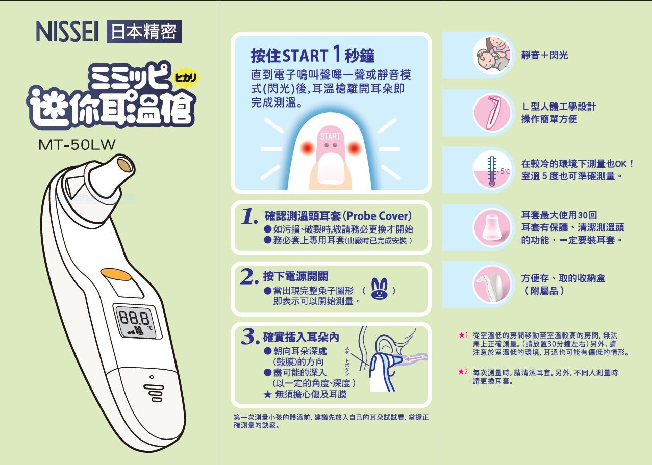 "日本精密”迷你耳溫槍 測量方式 : 紅外線式 外形尺寸 : 長105mmX寬32mmX高25 質量 : 約38g 附屬品 : 鋰電池一個(已安裝),收納盒,使用說明 書,品質保證書,塑膠測溫頭耳套4只(1只已安裝)