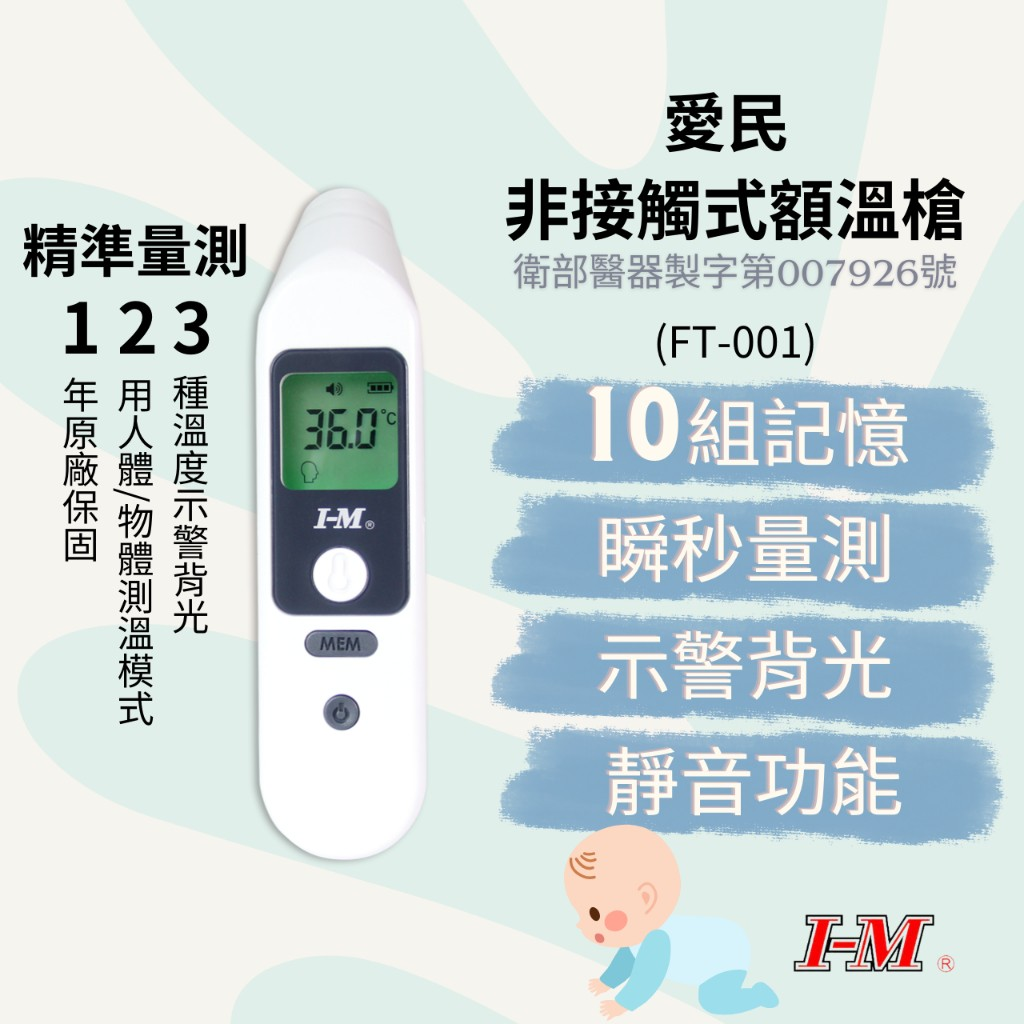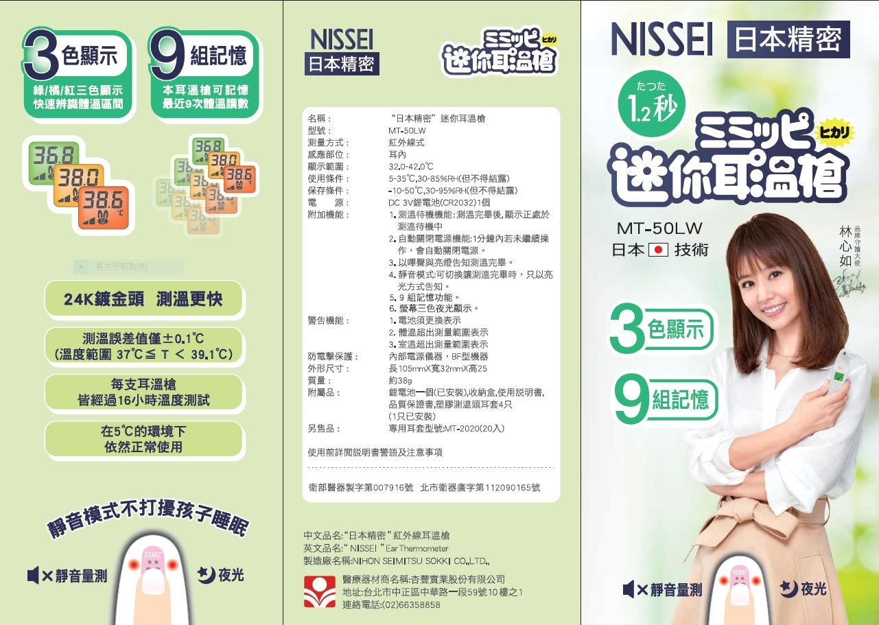 3色顯示 綠橘紅快速辨識體溫區間 9組記憶 可記憶最近9次體溫讀數 24K鍍金頭 測溫更快 "日本精密”迷你耳溫槍 測量方式 : 紅外線式 外形尺寸 : 長105mmX寬32mmX高25 質量 : 約38g 附屬品 : 鋰電池一個(已安裝),收納盒,使用說明 書,品質保證書,塑膠測溫頭耳套4只(1只已安裝) 使用前請詳閱說明書警語及注意事項 衛部醫器製字第007916號 北市衛器廣字第112090165號 杏豐實業股份有限公司 台北市中正區中華路一段59號10樓之1 02-66358858