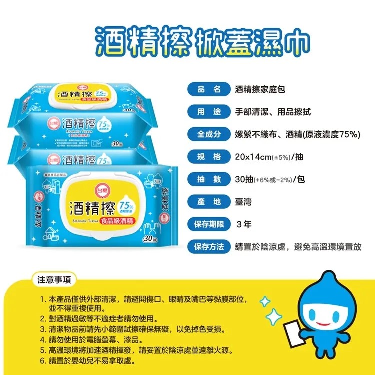 ◾️符合國家標準CNS食用酒精 ◾️無添加色素、香精及化學成分 ◾️掀蓋設計防止酒精揮發 ◾️台灣製造品質嚴格把關 成份:嫘縈不織布,酒精(原液濃度75%) 規格:30抽/包,每抽14x20cm(±5%) 產地:台灣 保存期限:3年