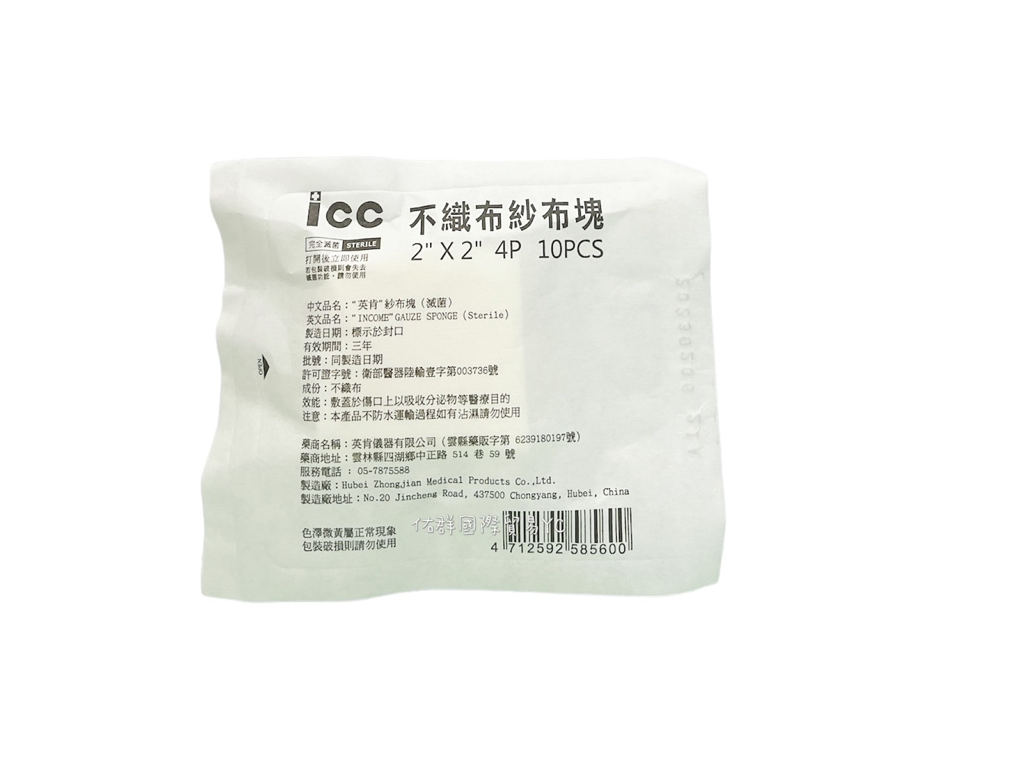 一袋50包 一箱14袋700包 ICC滅菌紗布3x3-8p(10PCS) 成份:純棉 效能:敷蓋於傷口上以吸收分泌物等醫療目的 注意:本產品不防水運輸過程如有沾濕請勿使用 製造日期:標示於封口 有效期間:三年 衛部醫器陸輸壹字第003736號 色澤微黃屬正常現象 包裝破損則請勿使用