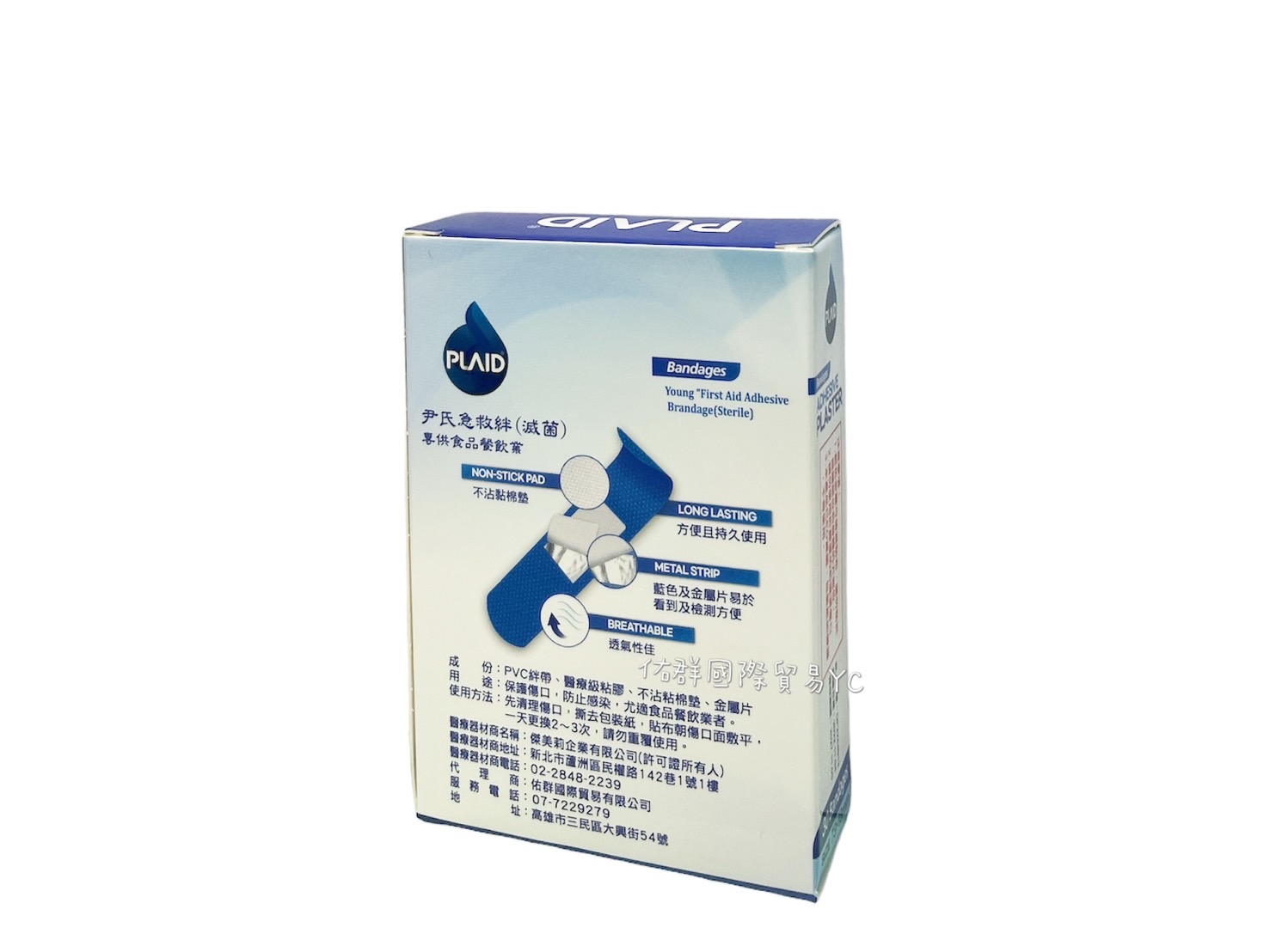 尹氏急救絆(滅菌) 專供食品餐飲業 30片裝(73x18mm) 不沾黏棉墊 方便且持久使用 藍色及金屬片易於看到及檢測方便 透氣性佳 成份:PVC絆帶,醫療級粘膠,不沾粘棉墊,金屬片 用途:保護傷口,防止感染,尤適食品餐飲業者 一天更換2-3次,請勿重覆使用