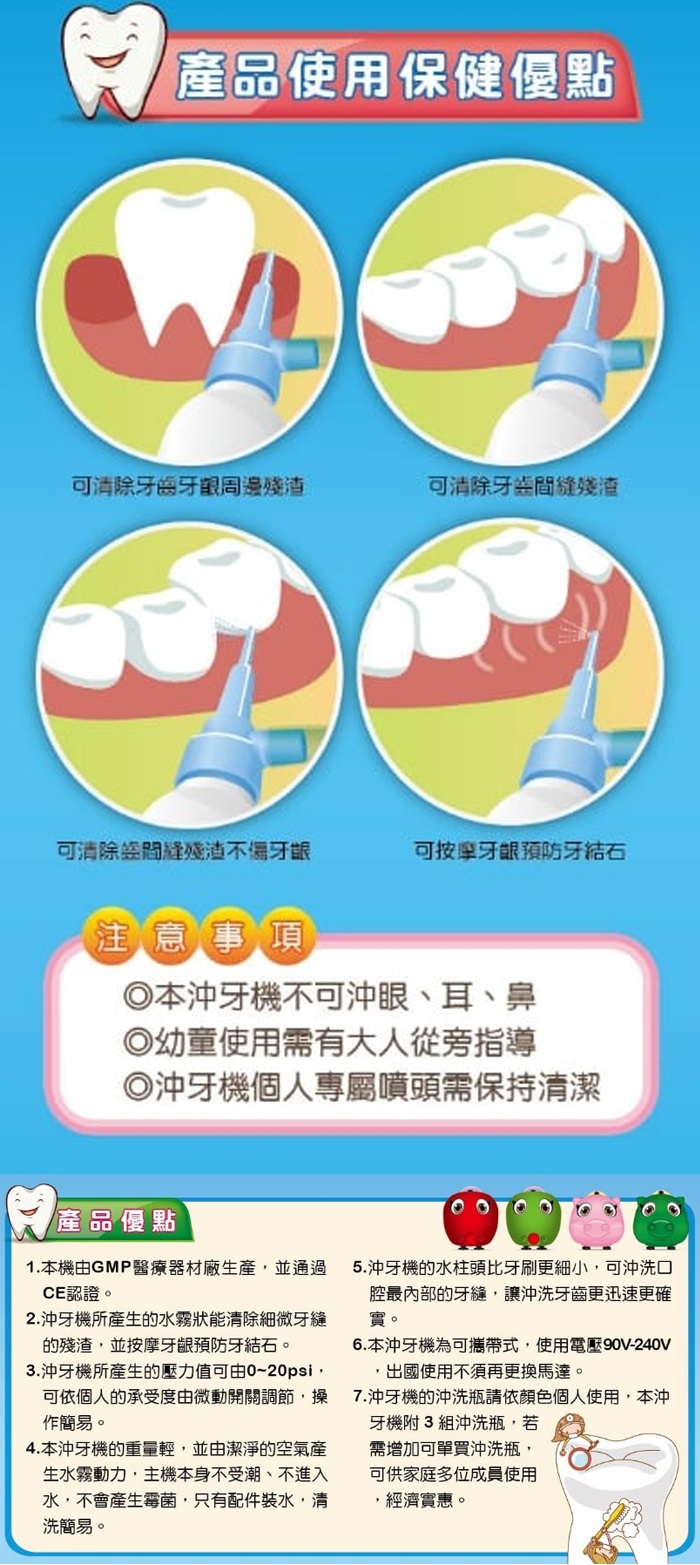 產品特性: ◆ GMP醫療器材廠生產 通過CE認證 ◆ 清除牙縫殘渣 預防牙結石 ◆ 可以個人習慣調節壓力值 ◆ 便於攜帶 出國不必更換馬達