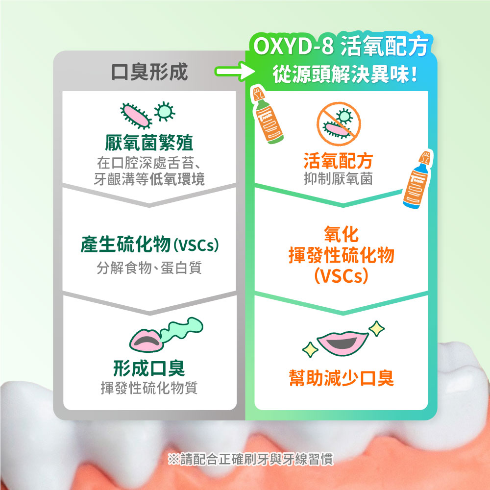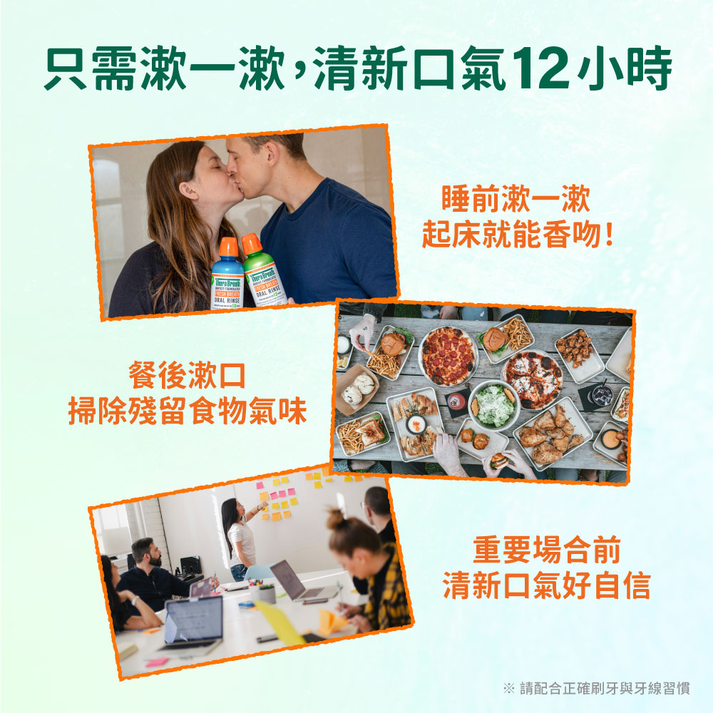 冰涼度 ★★★★☆ 活氧配方漱口水,清新持久12小時 美國版配方 專業牙醫研製 不染色、無酒精、純素食、無麩質 請配合正確刷牙與牙線習慣