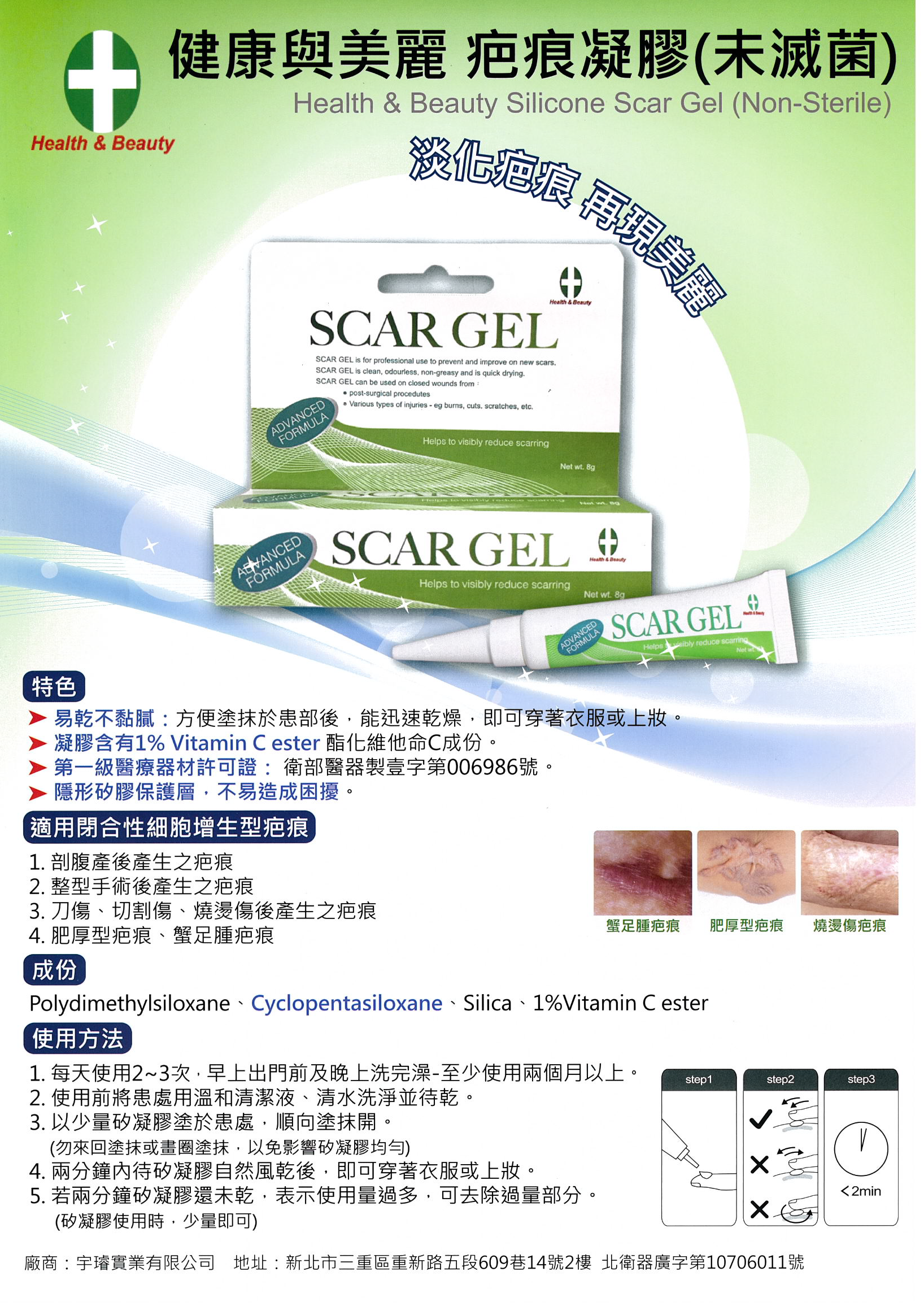衛部醫器製壹字第006986號 健康與美麗疤痕凝膠(未滅菌)15g 使用前請詳閱盒內產品說明書並遵照指示使用 成分:Polydimethylsiloxane,Cyclopentasiloxane,Silica,1%Vitamin C ester 規格:15公克軟管裝 保存方式:本品宜儲存與乾燥陰涼處,與幼兒無法取得處 批號同製造日期:如標示 有效期限:五年 注意事項:本品只供外用,塗抹部位發生紅疹及刺激性極少,但一旦發生請停止使用,並請教藥師醫師
