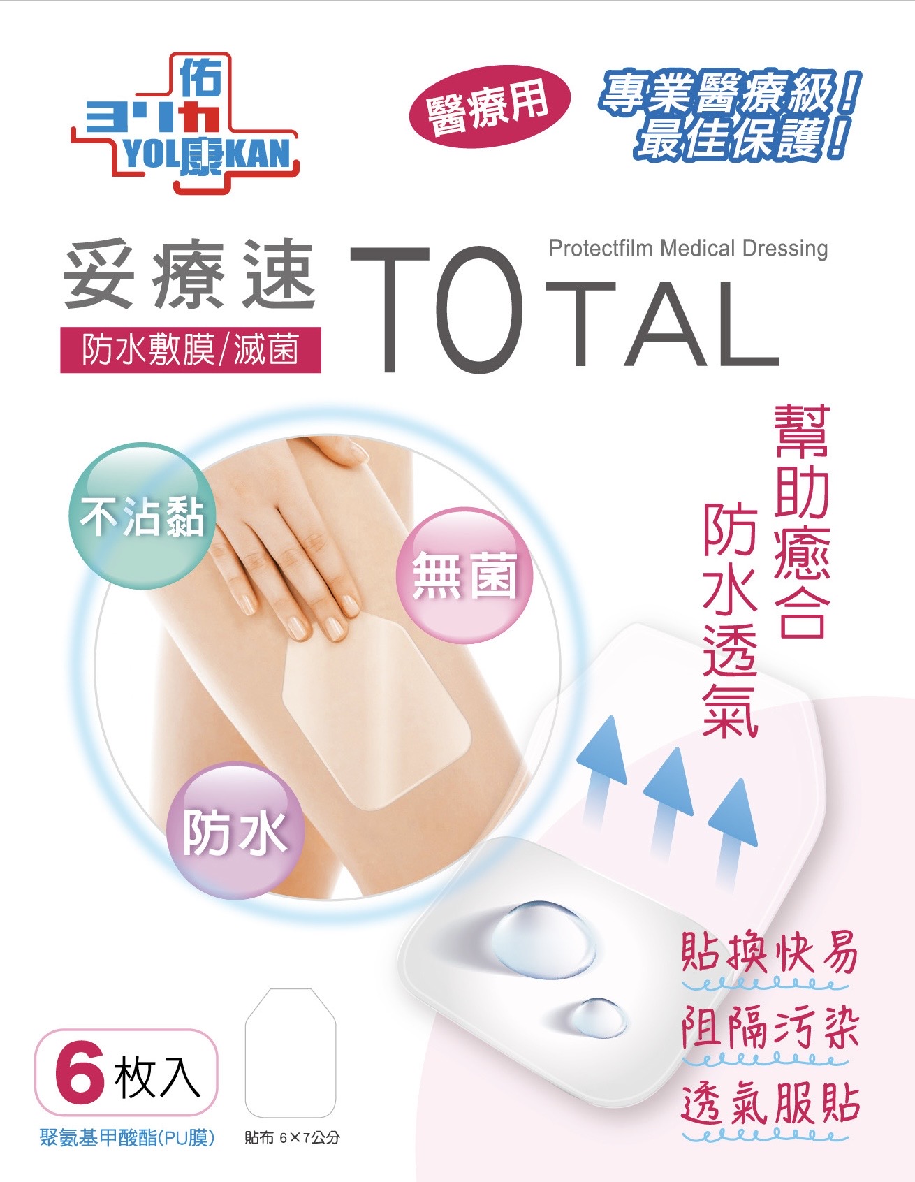 功能用途: 高防水 高透濕 親膚低過敏 保護傷口不疼痛 長照媽媽首選推薦 醫療器材許可證: 中文品名:"全新" 敷料薄膜貼布 (未滅菌) 許可證核准字號:衛署醫器製壹字第000088號 製造日期(或保存期限):請詳見產品包裝標示