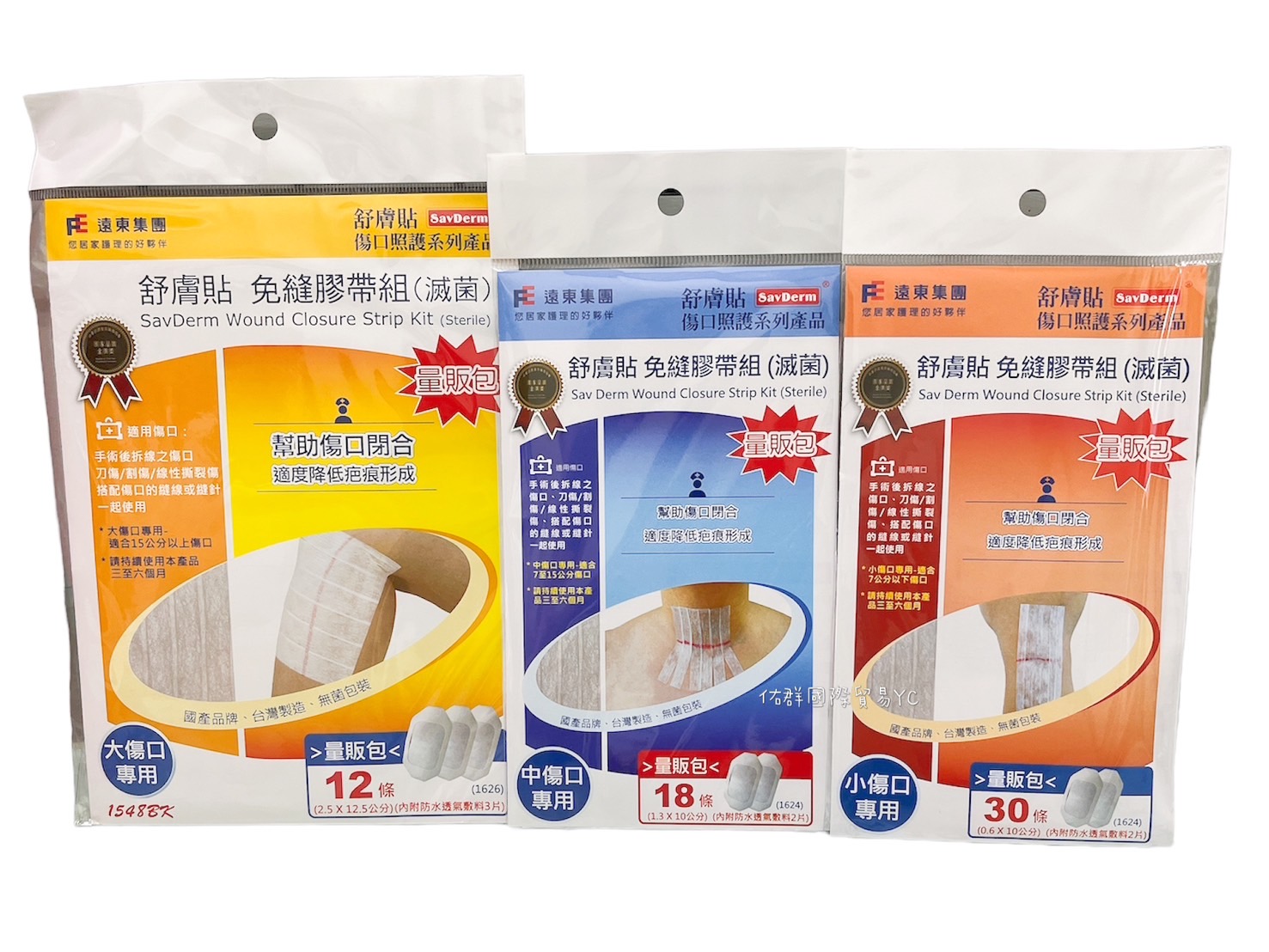 免縫膠帶組(滅菌) 產品特色 適用範圍 適用範圍:手術後拆線之傷口 / 刀傷/割傷/線性撕裂傷口 / 搭配傷口的縫線或縫針一起使用 商品規格: 各尺寸皆附有防水透氣敷料一片(以下尺寸為膠框中間之尺寸) 商品尺寸與適用傷口尺寸: