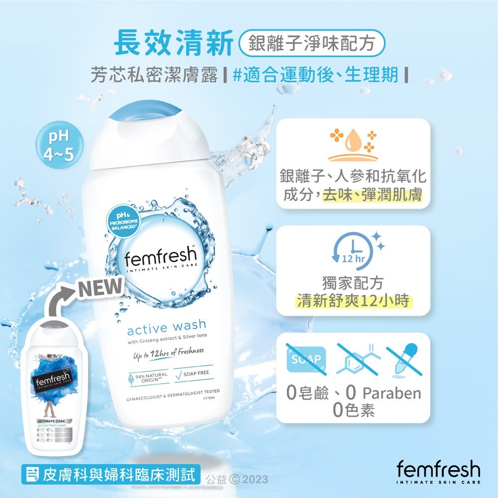 femfresh 私密潔膚露–長效清新(藍) 幫助去除尷尬異味,使生理期、運動後適用 ●銀離子、人參和抗氧化成分 ●12 小時獨家清新舒爽配方 ●不含色素、皂鹼、Paraben
